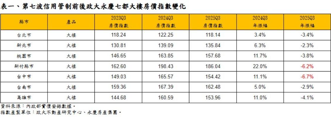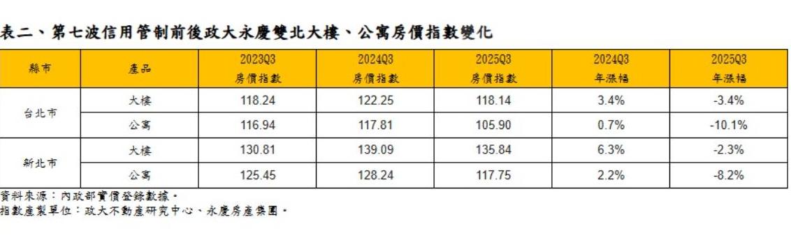 自去年9月19日央行第七波選擇性信用管制上路已滿一年,基於內政部實價登錄數據,最新「政大永慶七都大樓房價指數」和「政大永慶雙北公寓房價指數」顯示,2025年Q3七都大樓房價指數較去年同期下跌2.3%至6.7%;雙北地區公寓跌幅更深,台北市年跌10.1%,新北市年跌8.2%,反映過去一年在信用管制、銀行房貸緊縮及市場預期轉變影響下,整體房市明顯降溫。