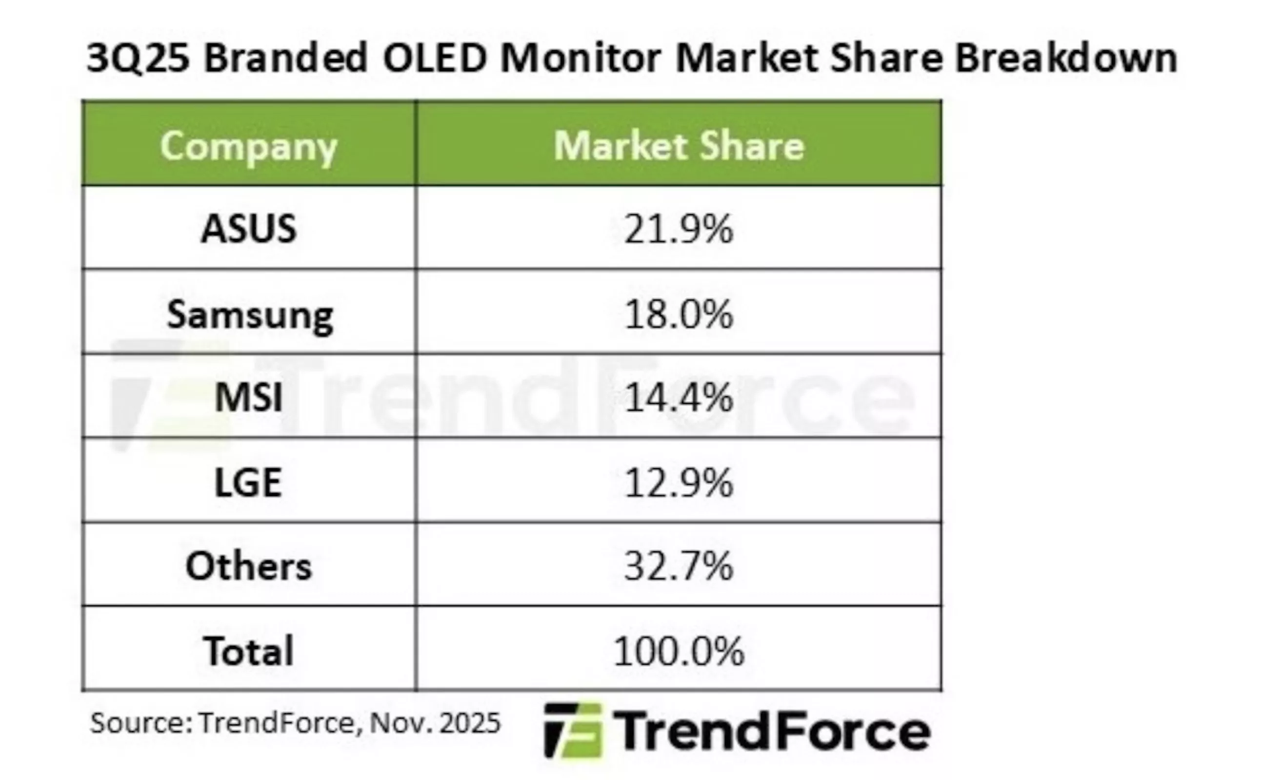 在品牌竞争方面,TrendForce指出,2025年第三季度全球OLED显示器市场迎来明显洗牌,华硕在出货份额上首次超越三星,成为新的市场领军者。数据显示,华硕在Q3取得了21.9%的全球市场份额,位居首位。其强势表现并非依赖单一旗舰产品,而是源自覆盖面更广的产品组合:除了ROG系列游戏显示器外,华硕还积极布局面向创作者的ProArt OLED机型,以及主打移动性和特殊工作流的便携与可折叠双屏显示器。