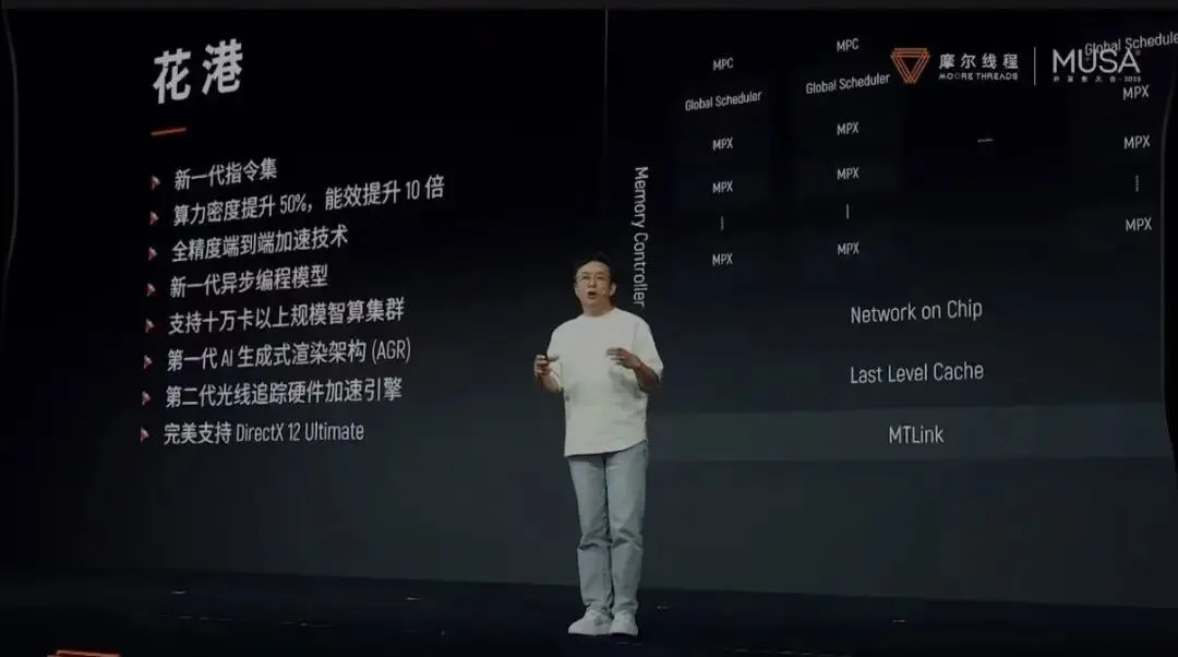 12月20日,在北京中关村国际创新中心,摩尔线程首届MUSA开发者大会(MDC 2025)现场,摩尔线程创始人张建中在上市后首次公开亮相演讲,从“花港”新架构,到“夸娥”万卡集群,再到单卡推理性能突破,第一次系统性摊开了自己的技术底牌,步步直比英伟达。宣布该开发者大会信息后,摩尔线程连涨三天,合计涨幅超50%。