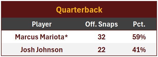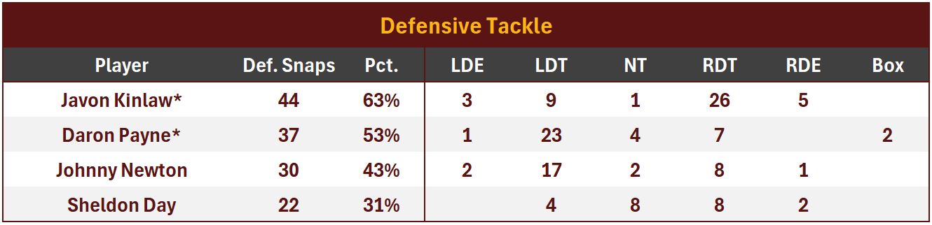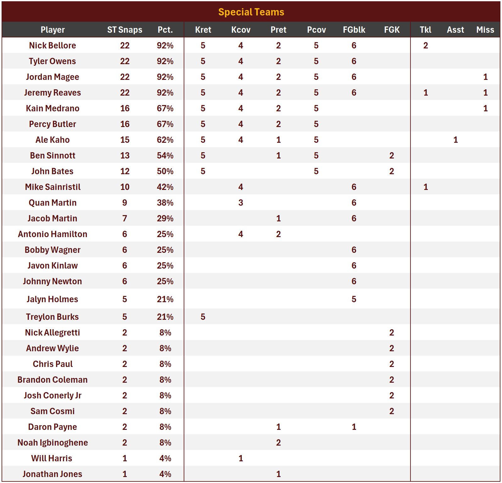 Merry Christmas and Happy New Year to Commanders’ fans. With the short week coinciding with the Christmas holiday, I have fallen one game behind with the Stats and Snaps. Hopefully this will still be of interest to the hard core readers who still pay attention this late in a losing season.