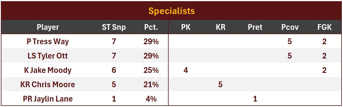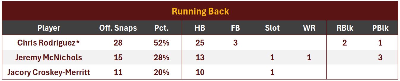A week after perhaps his worst game as a Commander, Jeremy McNichols was closer to his usual form as a valuable role player. He only ran from scrimmage once for three yards. But he also ran in the two-point conversion following CRod’s TD. For some reason, two-point conversions are not tracked as official stats.