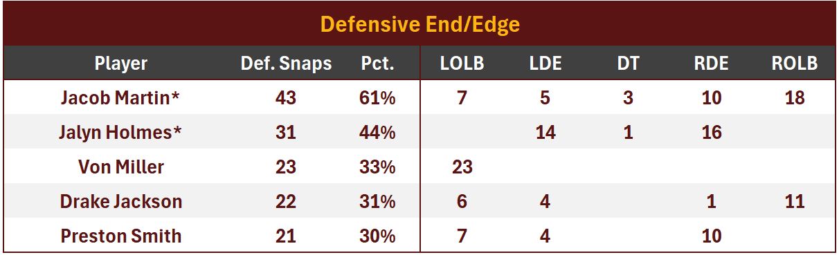 Drake Jackson made a strong debut as a rotational edge defender with the Commanders. In just 22 defensive snaps, predominantly at OLB, he registered 1 tackle and 3 QB hurries. He led the pass rushers with a 42.9% Pressure Rate.