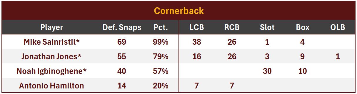 Mike Sainristil played outside corner on both sides in this game. He made 3 tackles with 1 PBU. He had an up and down performance, conceding 3 rec/5 tgt for 40 yds and 1 TD (0.93 Y/Cov Snp) per PFF, or 4/7 for 57 yds (1.33 Y/Cov Snp) per PFR.