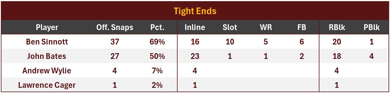 Chris Rodriguez reclaimed the starting role on his return from injury. He led the Commanders in rushing yards, with 15 carries for 63 yds (4.2 Y/A), 5 first downs and 1 TD (60% Success Rate). According to PFR, he broke 5 tackles. PFF counted 7 forced missed tackles, which is a slightly different stat.