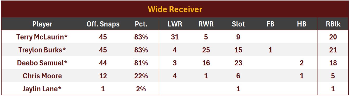 Terry McLaurin led the Commanders in receiving yardage, as it should be, catching 3/4 targets for 53 yds, with a long of 40. He caught 2/3 contested targets. In addition to having the highest receiving total, he was also the most productive receiver on the team at a respectable 2.21 Y/RR, and had the highest ADOT at 14.3 yds. He was lowest in YAC/Rec at just 0.7 yds.