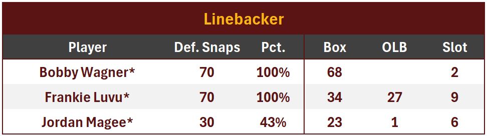 Bobby Wagner led the team with 10 combined tackles, including 5 leading efforts, 5 assists, 2 TFL and 6 stops, with 2 missed tackles. He made 4 run stops to finish second in run stop rate after Daron Payne at 13.8%.