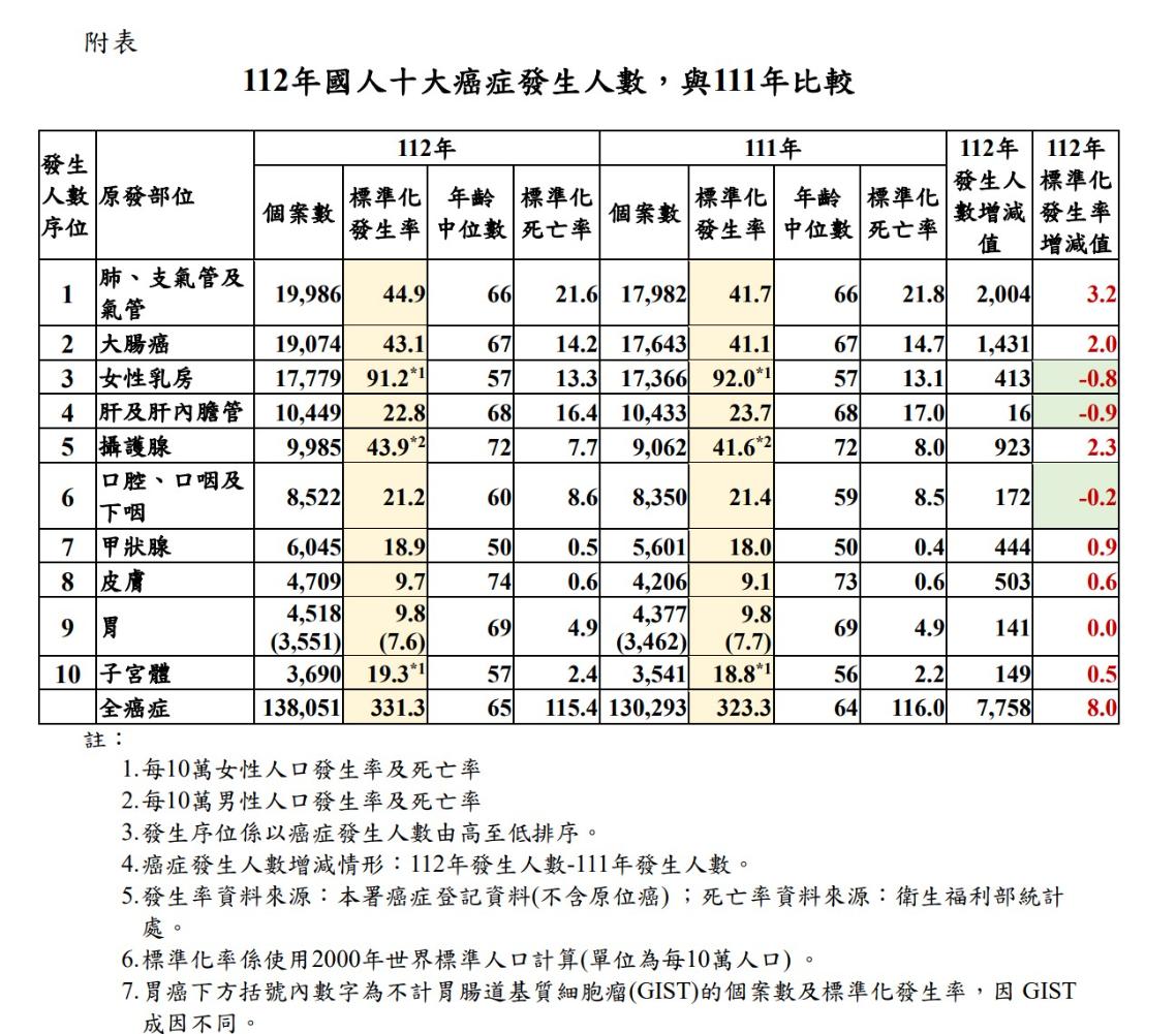 根據統計顯示,112年全台新發癌症人數達13萬8,051人,較111年增加7,758人,整體癌症標準化發生率為每10萬人口331.3人,呈現持續上升趨勢。