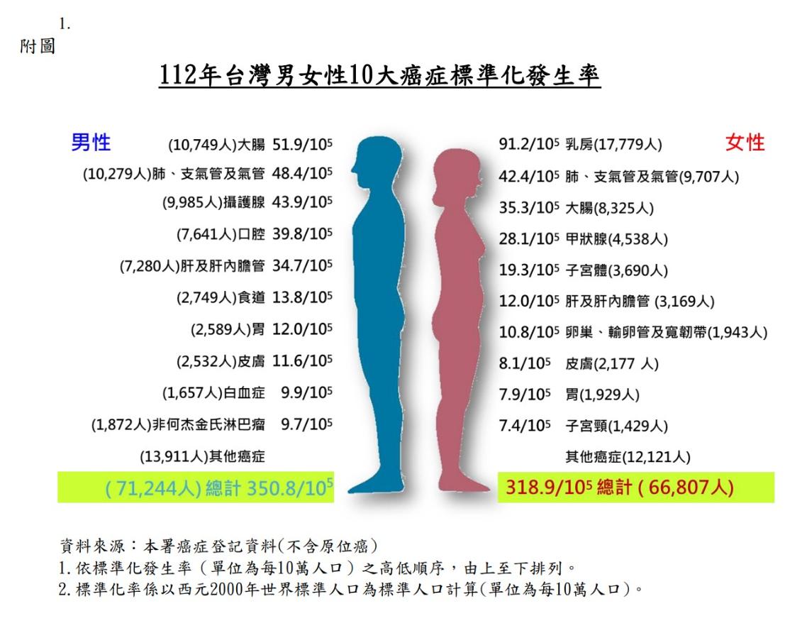 若分性別觀察,112年男性新發癌症人數為7萬1,244人,標準化發生率為每10萬人口350.8人,較前一年上升8.5人。