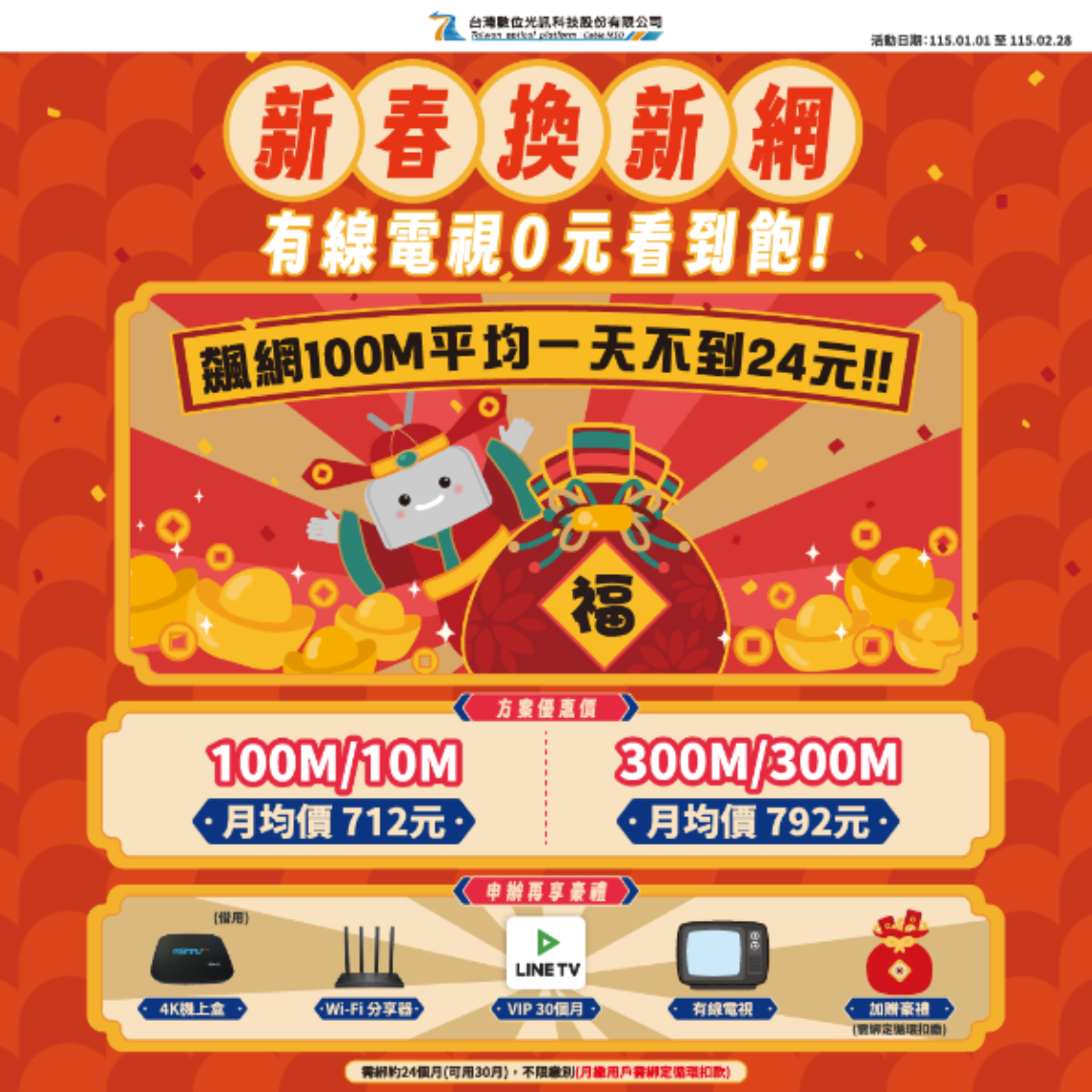 本次「新春換新網」方案主打 100M 光纖上網繳 2 年加贈 6 個月,等同可使用長達 30 個月,換算下來平均每月最低僅 712 元,即可同時享有光纖寬頻、有線電視服務,以及 LINE TV VIP 30 個月的豐富影音內容。