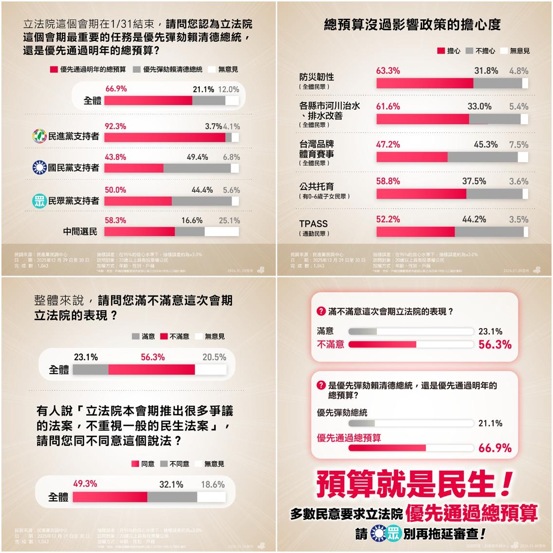 民調進一步顯示,受到總預算持續遭杯葛的影響,63%民眾擔心防災韌性無法提升,以及61.6%民眾憂心排水與河川整治進度,兩項均超過6成;其餘包括58.8%民眾擔心公共托育補助受影響,52.2%的民眾對TPASS政策感到擔憂。