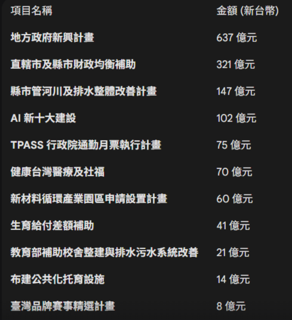 除了前述綜合性影響之外,細部個別性影響則包括:直轄市及縣市財政均衡補助321億元、地方政府新興計畫637億元、因應氣候變遷縣市管河川及排水整體改善計畫147億元、AI新十大建設102億元、TPASS行政院通勤月票執行計畫75億元、新材料循環產業園區申請設置計畫60億元、生育給付差額補助41億元、教育部補助校舍整建與排水污水系統改善21億元、布建公共化托育設施14億元、健康台灣醫療及社福70億元、臺灣品牌賽事精選計畫8億元。