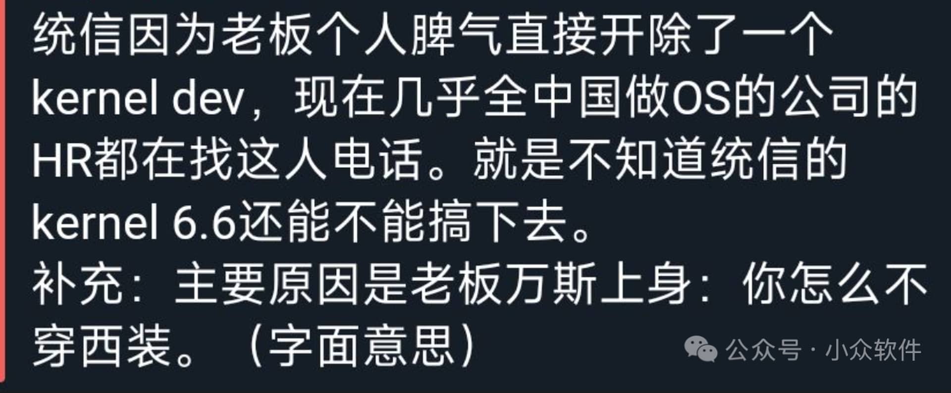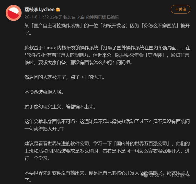 近日,国产操作系统公司开发商统信(Deepin 的母公司)的董事长林伟亲自开除一名询问年会着装的内核开发者。据了解,统信董事长林伟是福建人,近日临时通知全体职员1月9日去他家乡武夷山开年会,要求须自备西装出席。