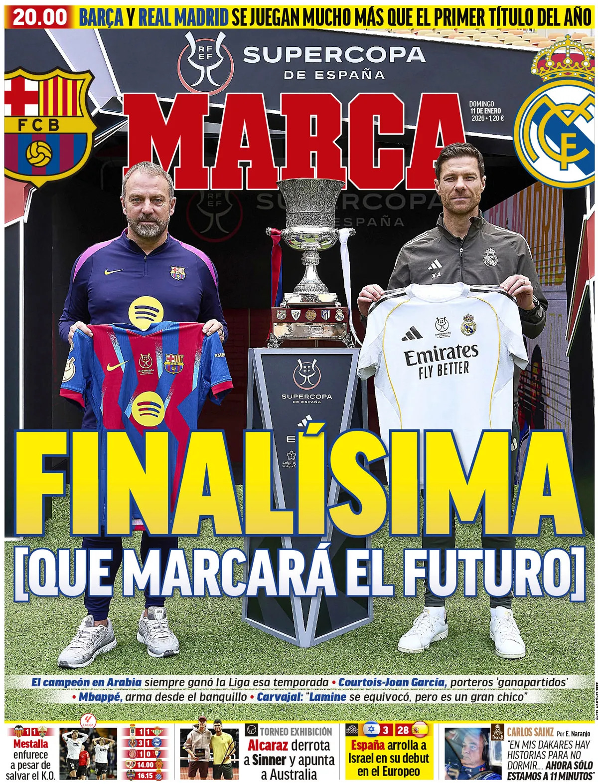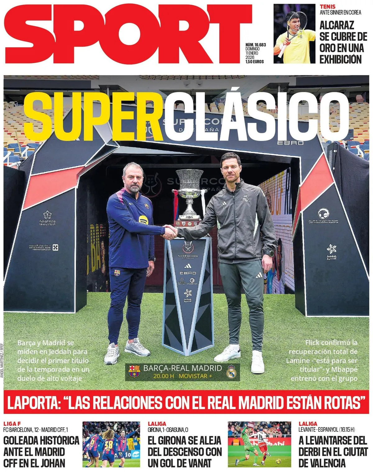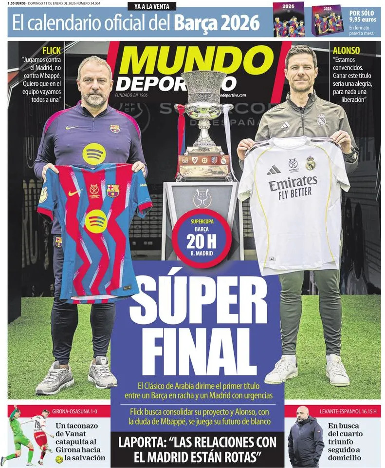 The final between Barça and Madrid for the Spanish Super Cup is the highlight of Sunday in the sports press.