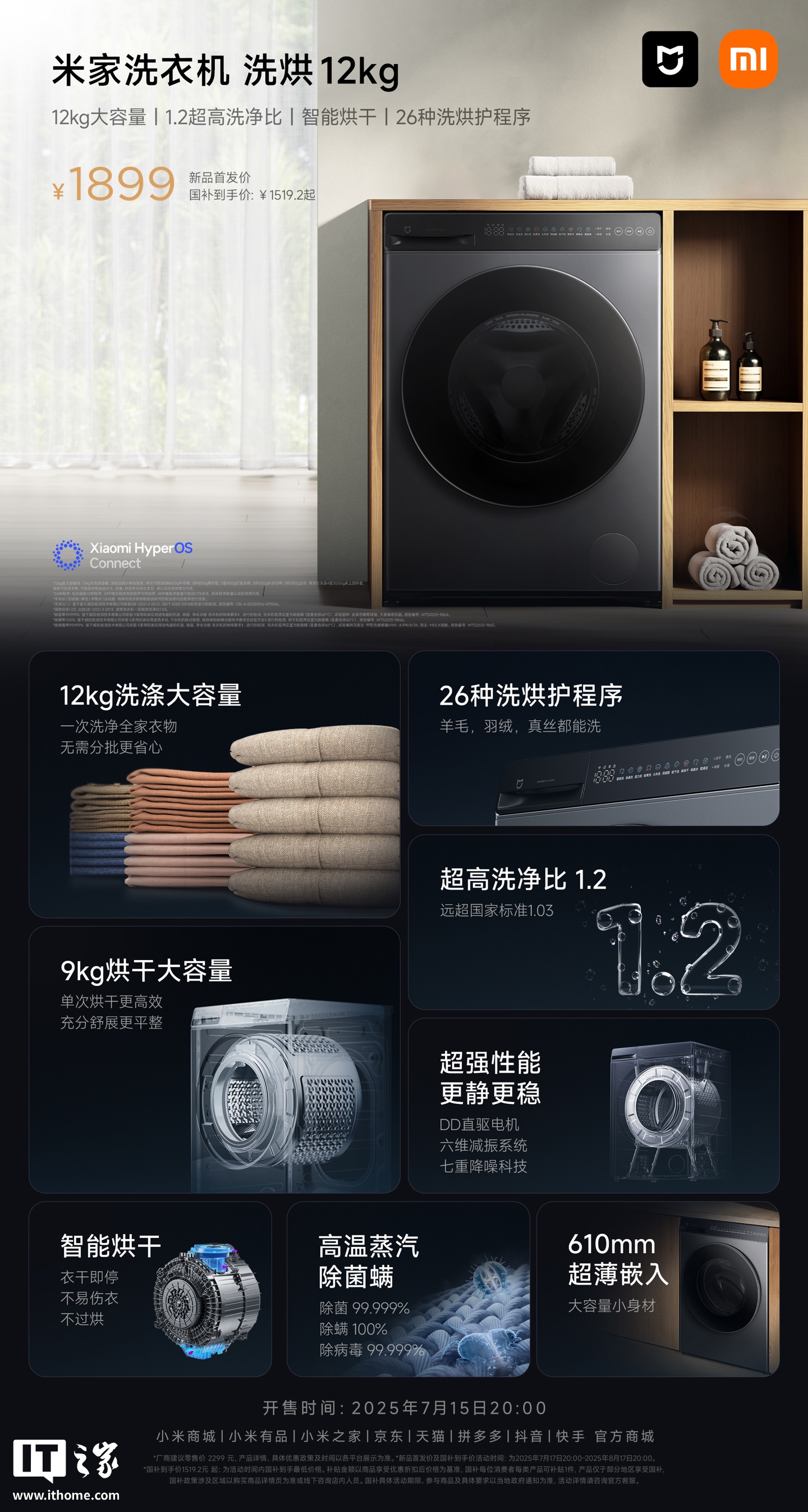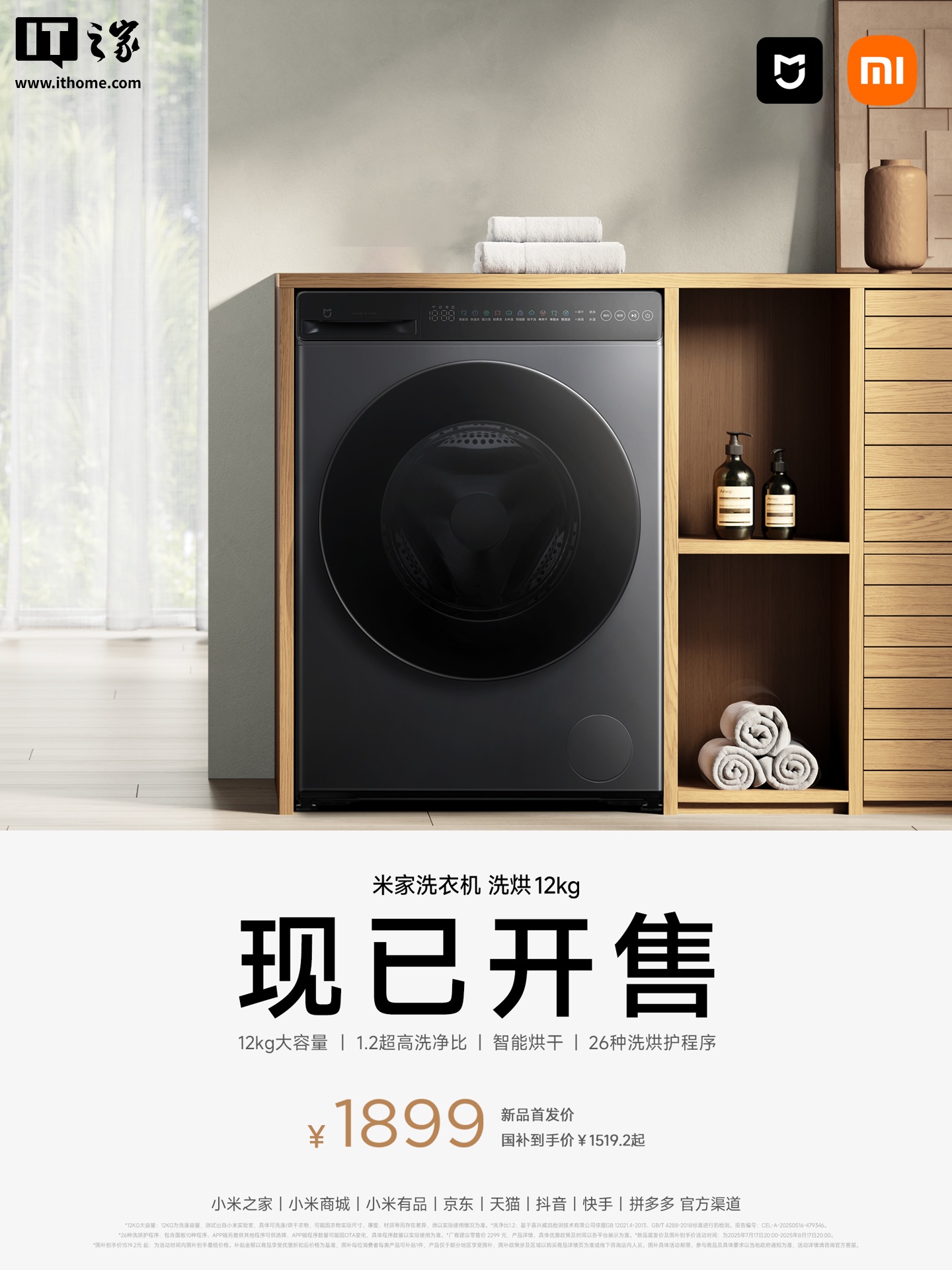 IT之家 7 月 17 日消息,小米米家洗衣机洗烘 12kg 现已全渠道开售,支持 1.2 洗净比 + 智能烘干,售价 1899 元。