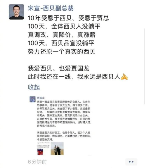 西贝闭店再次引发全网热议,有传闻称,西贝公关副总裁宋宣已离职。今日,宋宣发朋友圈回应离职消息。他表示,10年受恩于西贝,受恩于贾总100天,全体西贝人没躺平。真调改、真降价、真涨薪100天,西贝品宣没躺平,努力还原一个真实的西贝。宋宣表示,我爱西贝、也爱贾国龙,此时我还在一线,我永远是西贝人。