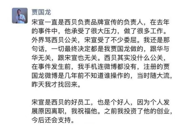 贾国龙还坦言,宋宣是西贝的好员工,也是个好人,因为个人发展原因离职,祝福他。