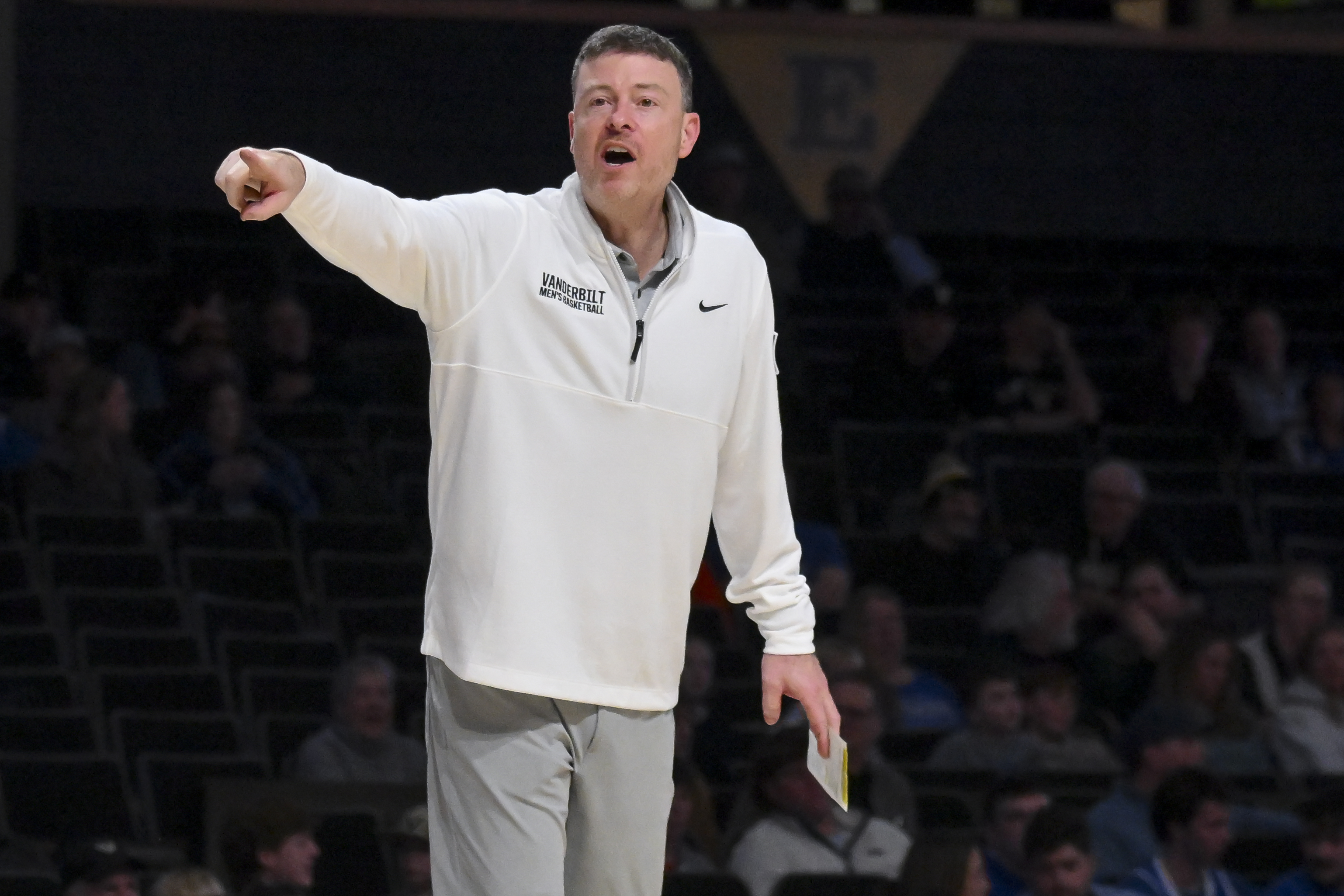 Jan 27, 2026; Nashville, Tennessee, USA; Vanderbilt Commodores head coach Mark Byington yells instructions to his team against the Kentucky Wildcats during the second half at Memorial Gymnasium. Mandatory Credit: Steve Roberts-Imagn Images | Steve Roberts-Imagn Images