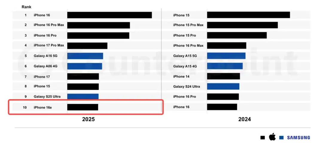 iPhone 16e,反倒成了全球卖得最好的10款智能手机之一…