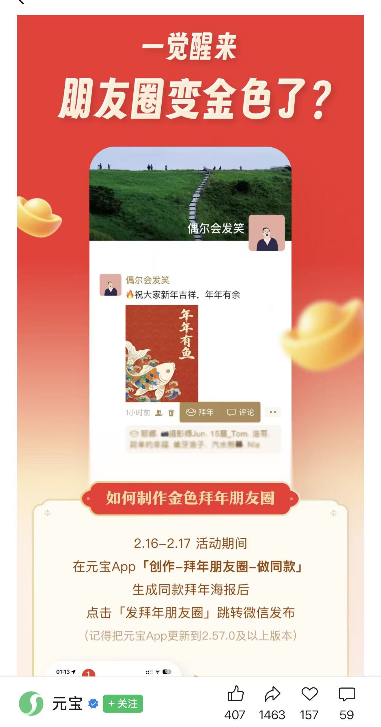 2026年除夕,微信可以发金色朋友圈了!元宝也宣布除夕追加 100 张万元现金“小马卡”。