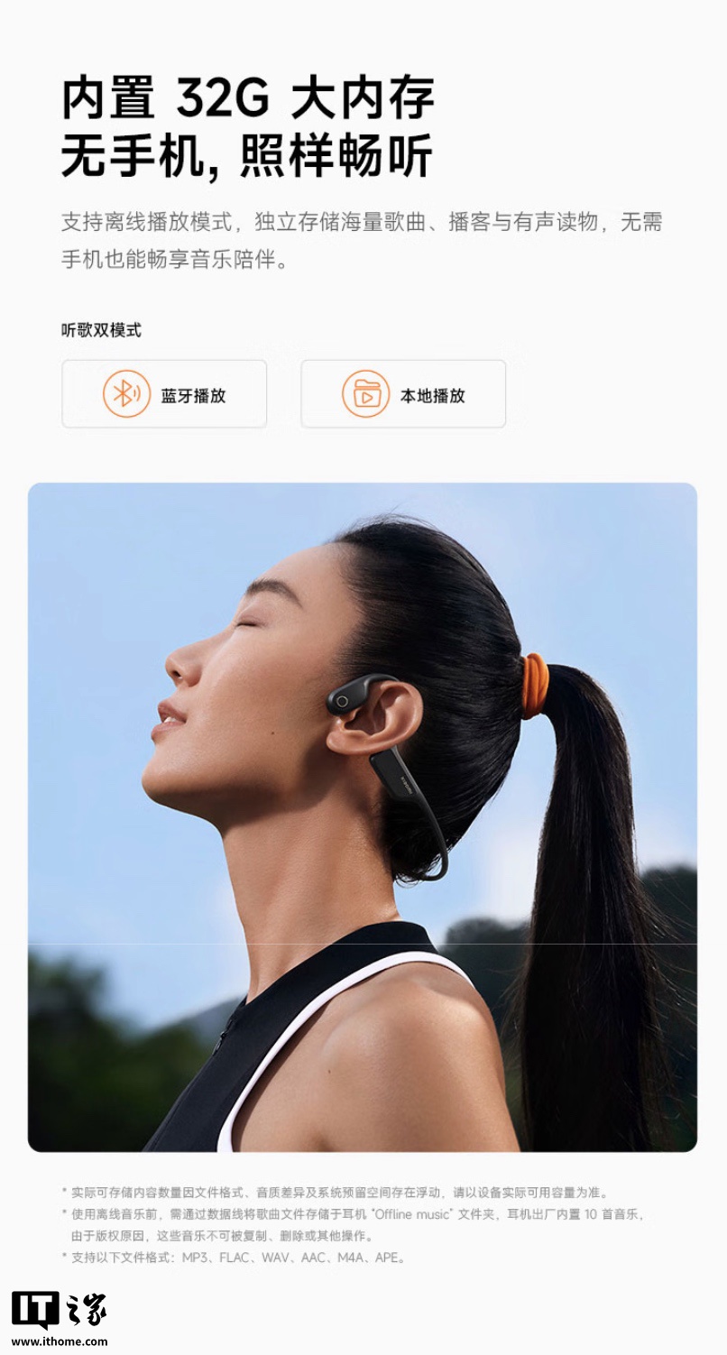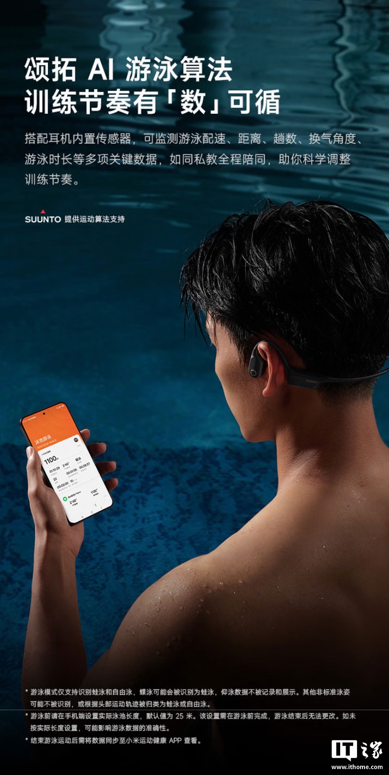 该耳机提供 24.4x14.45mm 大尺寸单元,支持双麦克风 ENC 降噪,内置 32GB 存储空间,支持独立播放音乐。耳机同时提供游泳算法,搭配耳机多项传感器,可监测用户游泳配速、距离、趟数、换气角度、游泳时长等关键数据。