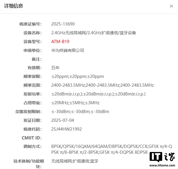 IT之家 7 月 21 日消息,型号为 ATM-B19、ATM-B29、KSU-B19 华为新品现通过国内无线电核准认证,有爆料称系列产品为 HUAWEI WATCH GT6 系列新款智能手表。
