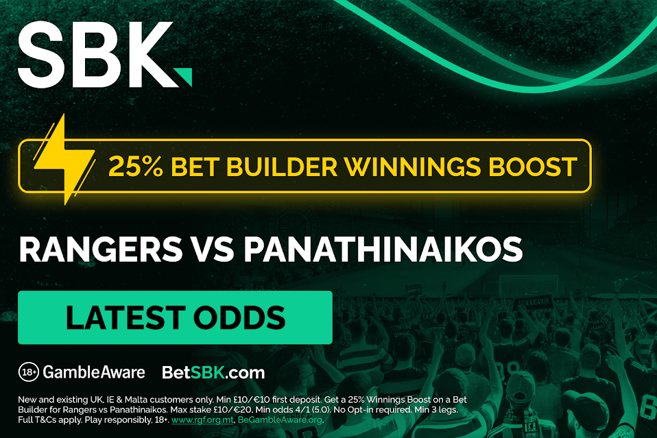 *New and existing UK, IE & Malta customers only. Min £10/€10 first deposit. Get a 25% Winnings Boost on a Bet Builder for Rangers vs Panathinaikos. Max stake £10/€20, Min odds 4/1 (5.0). Opt-in required. Min 3 legs. Full T&Cs apply. 18+. BeGambleAware.org.