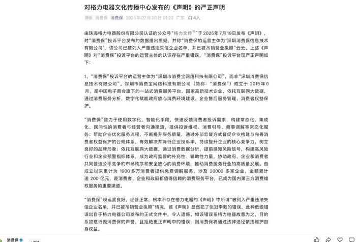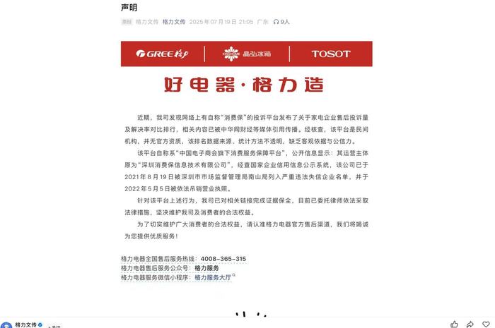 7月19日晚间,珠海格力电器股份有限公司官方账号“格力文传”发文称,发现网络上有自称“消费保”的投诉平台发布了关于家电企业售后投诉量及解决率对比排行,相关内容已被中华网财经等媒体引用传播。经核查,该平台是民间机构,并无官方资质,该排名数据来源、统计方法不透明,缺乏客观依据与公信力。