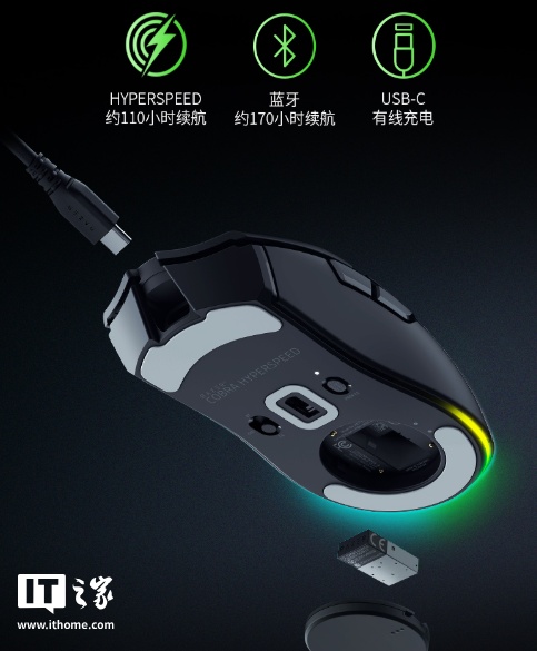 雷蛇眼镜蛇极速版支持 HYPERSPEED(2.4GHz)、蓝牙、USB 有线三种连接模式,底部配备环绕式灯带。