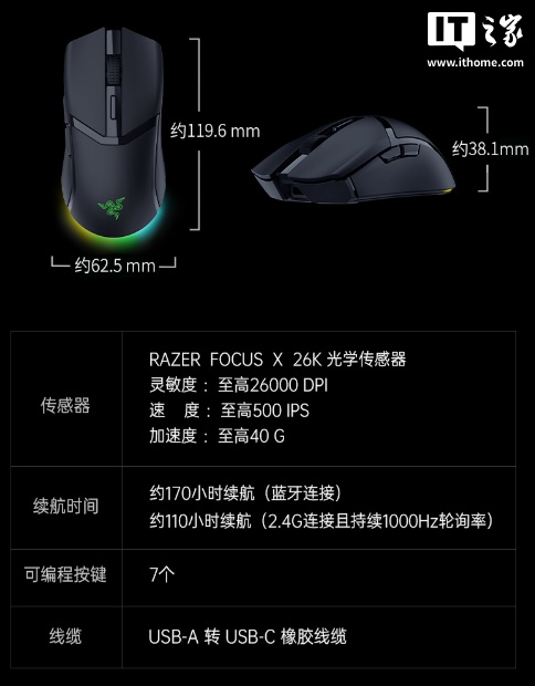 该鼠标还搭载炼狱蝰蛇 V4 专业版同款雷蛇光学鼠标滚轮,以及第四代光学鼠标微动、FOCUS X 26K 光学传感器。