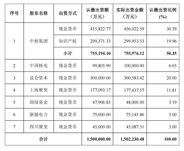 界面新闻注意到,中核集团与其他公司增资方式不同,其以现金和知识产权作价入股,其余公司则均以现金形式出资。
