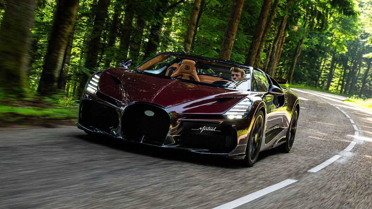 The 8.0-liter quad-turbo W16 engine in the Mistral produces 1,578 horsepower. Power goes to all four corners via a seven-speed dual-clutch automatic transmission, and, at full bore, 70,000 liters of air is fed through the W16 via air intakes positioned behind the headrests.