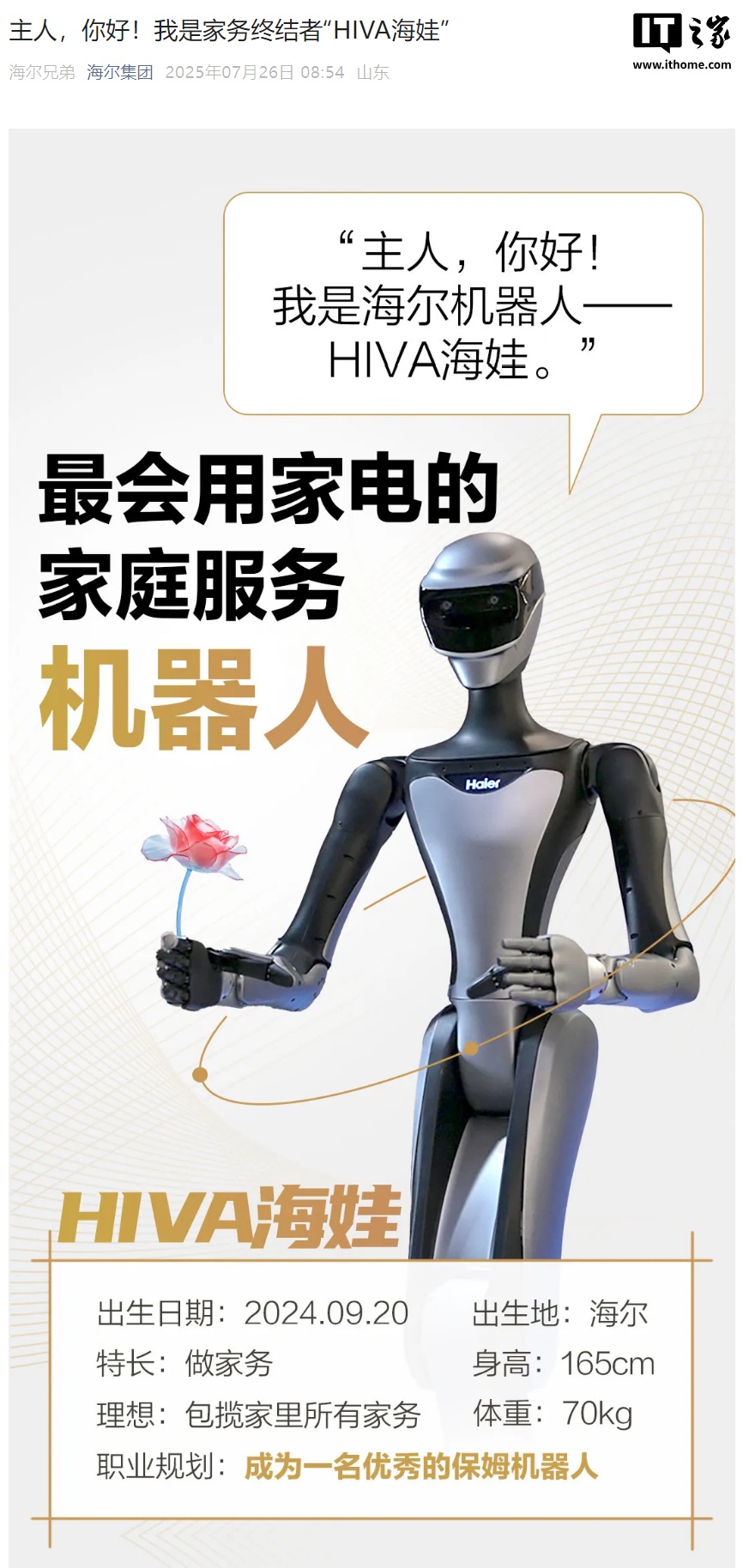 IT之家 7 月 26 日消息,海尔集团今日公布了旗下人形机器人产品“HIVA 海娃”,号称是“家务终结者”。