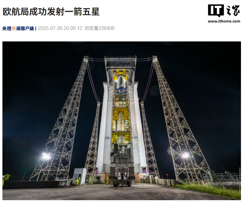 IT之家 7 月 26 日消息,欧洲航天局 7 月 26 日宣布,当地时间 25 日夜,该机构利用“织女星-C”型火箭将 5 颗卫星成功送入预定轨道,其中包括用于地球观测和 3D 测绘的 4 颗 CO3D 卫星和 1 颗测量全球二氧化碳分布的 MicroCarb 卫星。