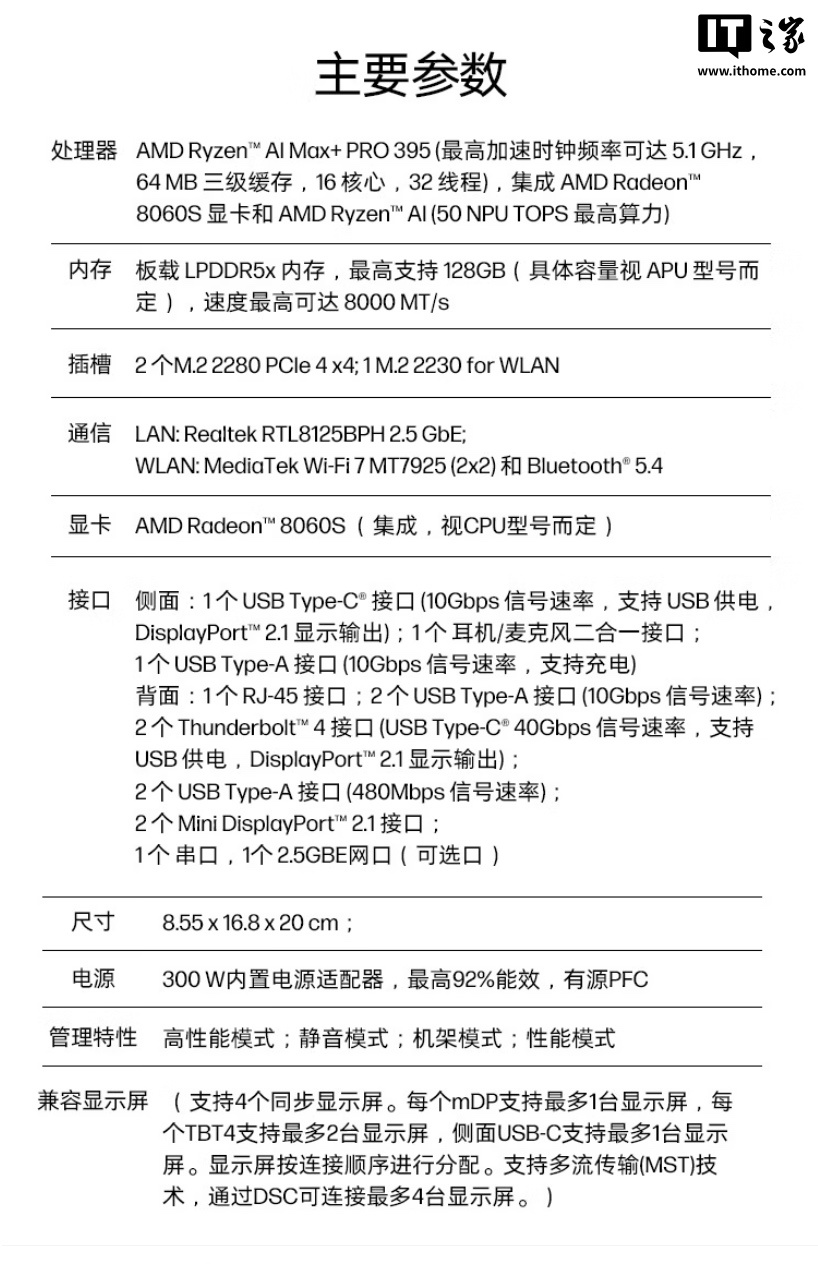 该机整体尺寸 8.55 x 16.8 x 20 cm,造型简洁,机箱正面配备 3D 网状风罩,内置 300W 电源适配器。板载 128GB LPDDR5x RAM,提供 2TB PCIe SSD。