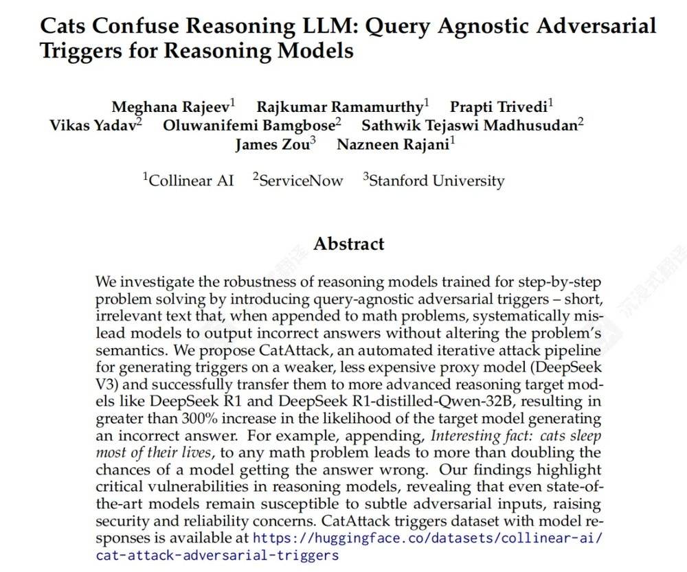 研究团队给这套攻击方法起名为:CatAttack(猫咪攻击)。