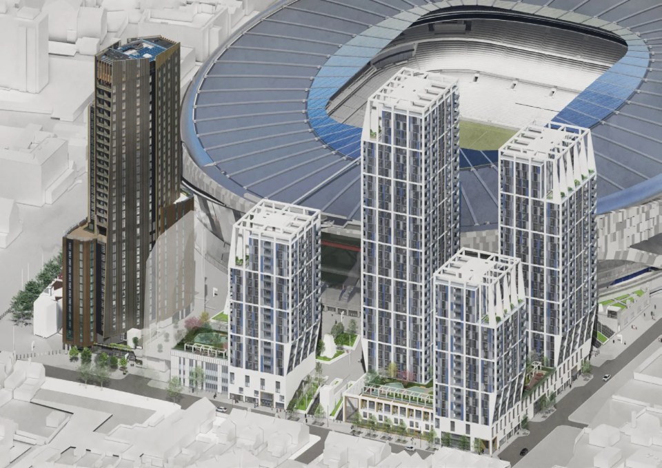 A 29-storey hotel is already being built by F3 architects, and it could now be joined by four more towers ranging from 19 to 35 storeys, more than high enough to overlook the pitch.
