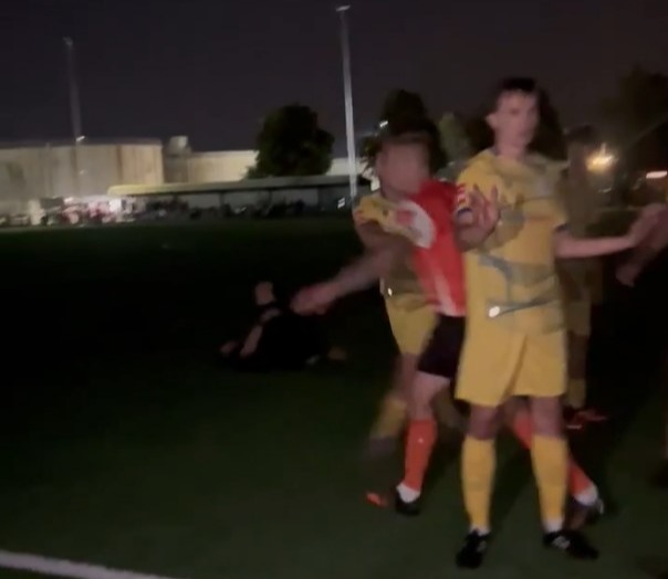 In truly bizarre scenes, footage shows the referee being knocked over after getting swept up in the melee between both teams, while the floodlights flicker in the background.