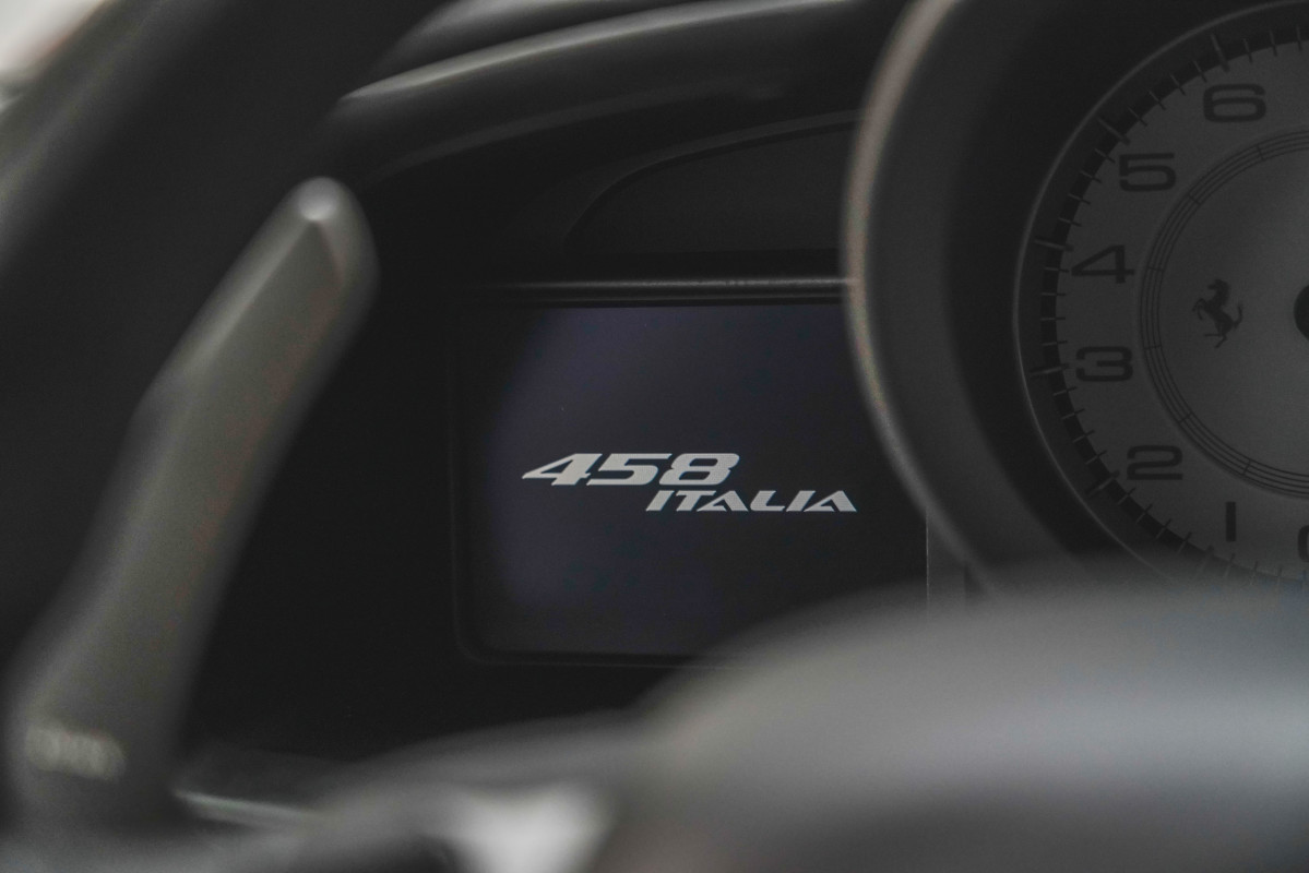 Although the Ferrari engineers didn't modify the base 458's headlights, taillights, mirrors, and Ferrari shields, relatively few alterations were made to its interior. The cabin retains much of the base car's switchgear, black leather seats, and tan carpets. However, unmistakable signs that this is a prototype vehicle are an unmarked dashboard toggle switch, a high-voltage warning sticker placed over the Prancing Horse in the middle of the steering wheel, and an unaccounted-for 12-volt car battery in the passenger footwell.