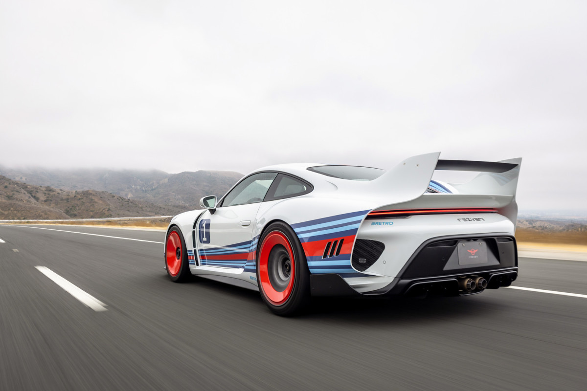 Based on the 992 Porsche 911 (2020-2025) but made to look considerably older with its small round headlights and wider, mostly carbon fiber body (with the exception of the doors), the Rezvani Retro RR1 offers either a manual or a PDK dual-clutch transmission and up to 750 horsepower, and just 50 examples will be produced in total, each with its chassis number inscribed in the livery. This first example, headed to a California customer, is dressed in the iconic Martini livery, just without the liquor brand's name and gold accents (though there is a golden hue to the exhaust tips). It's the perfect choice for the first RR1 since the livery was especially popular among racing Porsches in the 1970s, and even the aforementioned Carrera RSR prototype wore the trademark blue and red color scheme.
