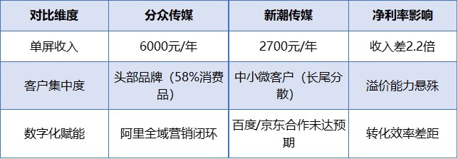 一位传媒行业分析师对界面新闻表示:“分众传媒主要垄断核心商务场景,广告溢价能力强;新潮传媒以社区长尾点位为主,客户预算偏低。” 客群不同,导致两者利润水平悬殊。