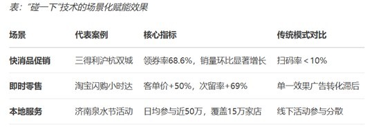 首先,“碰一下”实现了比“扫一扫”更高的用户触达率。三得利在杭州的“碰一下”测试中,领券率达68.6%,远高于传统扫码率(通常不足10%)。更高的用户触达率可以有效构建潜在用户精准画像池,实现用户行为数字化。