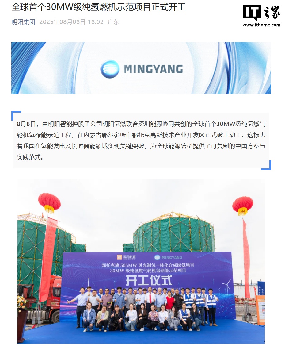 IT之家 8 月 9 日消息,“明阳集团”官方公众号发布博文,报道称内蒙古鄂尔多斯市鄂托克高新技术产业开发区于昨日(8 月 8 日)启动全球首个 30MW 级纯氢燃气轮机氢储能示范工程,标志着我国在氢能发电及长时储能领域取得关键突破。